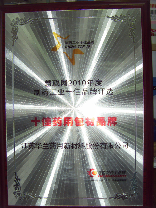 2011年8月18日,由慧聰制藥工業(yè)網(wǎng)主辦的“創(chuàng)新•責任•影響力——2010年度制藥工業(yè)十佳品牌評選”頒獎盛典在北京釣魚臺國賓館隆重舉行。經(jīng)過行業(yè)專家層層評審,慧聰揭曉了“十佳制藥裝備民族品牌”、“十佳制藥裝備創(chuàng)新品牌”、“十佳制藥裝備新銳品牌”、“十佳藥用原輔料品牌”、“十佳藥用包材品牌”、“十佳配套設(shè)備品牌”六大獎項。我公司“華蘭”品牌在本次評選中榮獲“十佳藥用包材品牌”稱號。