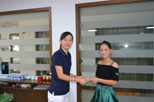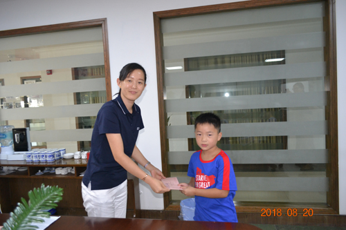 行政人事部經(jīng)理胡靜為員工子女頒發(fā)獎(jiǎng)金
