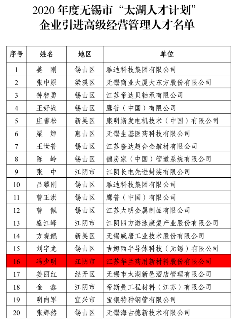 喜訊一:近日,2020年無錫市“太湖人才計(jì)劃”入選名單正式公布,我司質(zhì)量總監(jiān)馮少明先生榮幸入選。