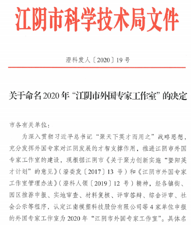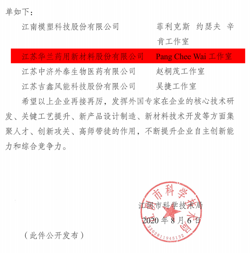 喜訊二:我司“Peng Chee wai工作室”,被江陰市科技局成功認(rèn)定為 “江陰市外國(guó)專家工作室”。