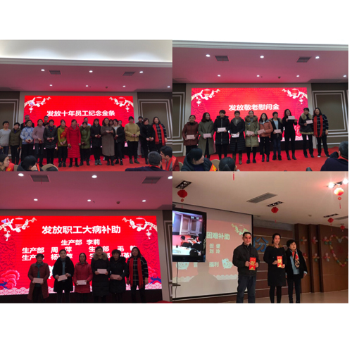 年會(huì)上,公司頒發(fā)普惠制福利,發(fā)放敬老慰問金,職工大病補(bǔ)助及困難職工補(bǔ)助,向員工及家屬送去關(guān)懷與溫暖,讓員工享有一個(gè)平安年,幸福年。此外,華蘭股份的快速發(fā)展與老員工們?yōu)橹冻龅男燎诤顾欠植婚_。為感謝他們對(duì)企業(yè)的發(fā)展貢獻(xiàn)的智慧和力量,公司特向工作10年以上的老員工發(fā)放紀(jì)念金條。